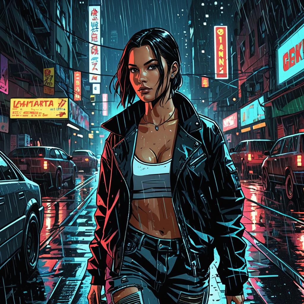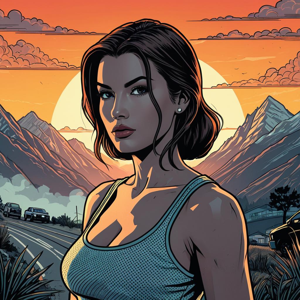 Hot girl, vibrant carnival, in the style of a Grand theft auto, loading screens, gta style artwork, highly detailed, celshading, digital painting style, dramatic composition, 21st century comic book cover, studio lighting, bold contour lines drawing