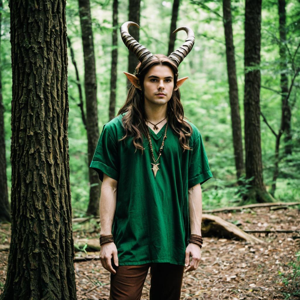 Young male faun cosplay standing in a green forest, wearing a loose green tunic, brown pants, and adorned with long twisted horns, pointed elf ears, long brown hair, and tribal-style jewelry including necklaces and bracelets. The setting is a dense woodland with trees and natural ground cover.