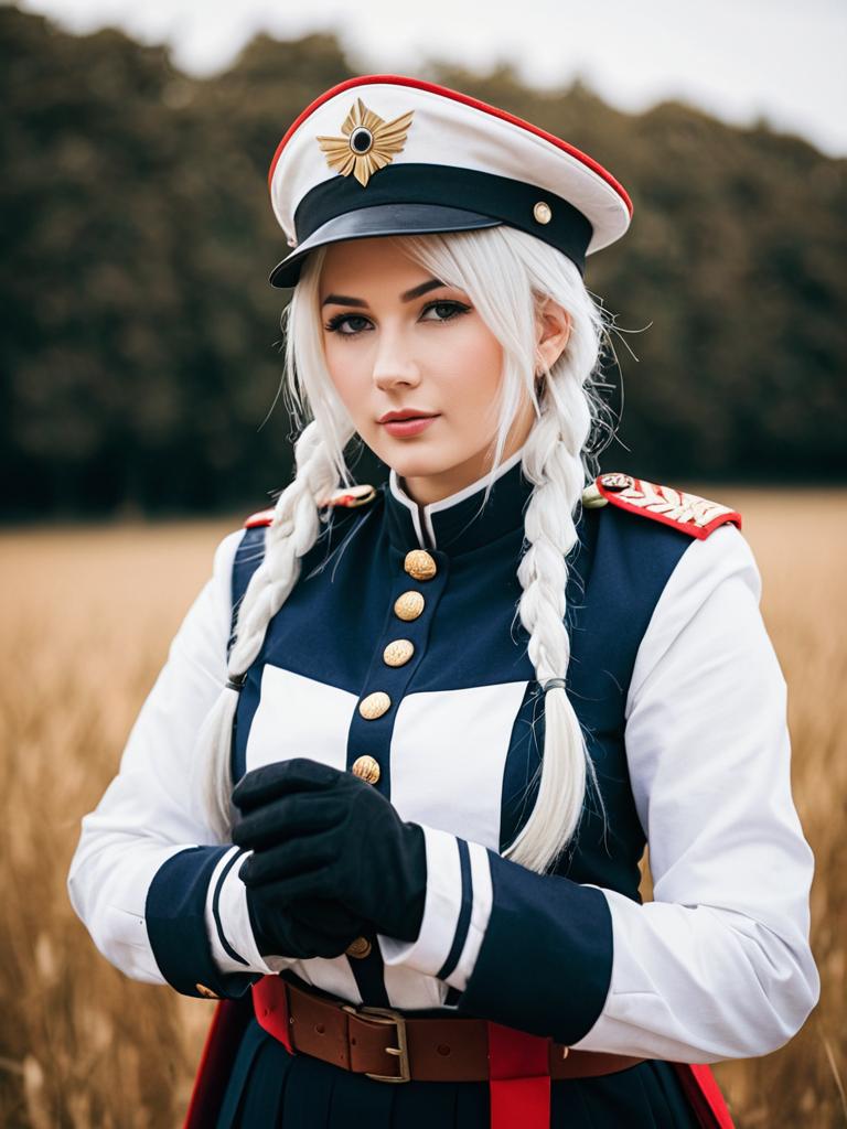 Photo-realistic portrait of a young woman with white hair styled in twin braids wearing a detailed Altair cosplay military uniform. The costume features a high-collared navy and white jacket with gold buttons and red epaulettes, matched with a white and black shako cap with gold insignia. She also wears black gloves and a brown belt, posed outdoors with a blurred natural background showcasing warm tones and soft lighting.
