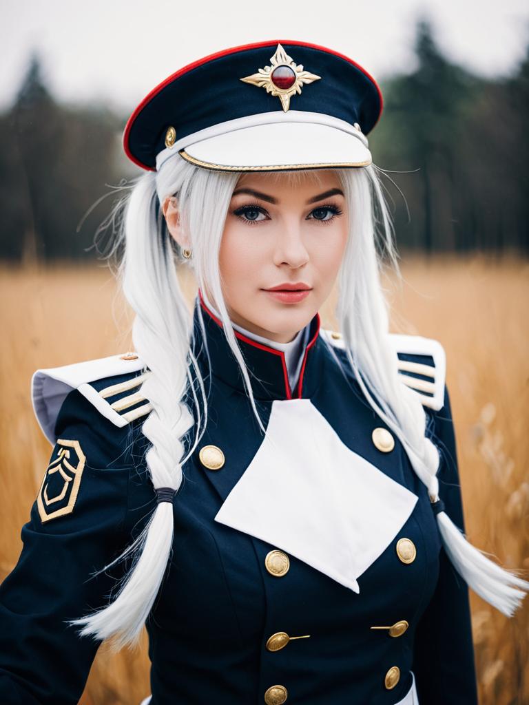 Photo-realistic cosplay photo of person in altair (re:creators) costume. 1girl, red eyes, hair between eyes, white hair, very long hair, long hair, twintails, military uniform, shako cap, military uniform, high collar, gauntlets, epauletteslifestyle stock photo, shallow depth of field, lifestyle stock photography, shallow depth of field, natural lighting, warm tones, soft background blur, candid moments, vibrant colors, realistic textures, modern casual clothing. full body shot