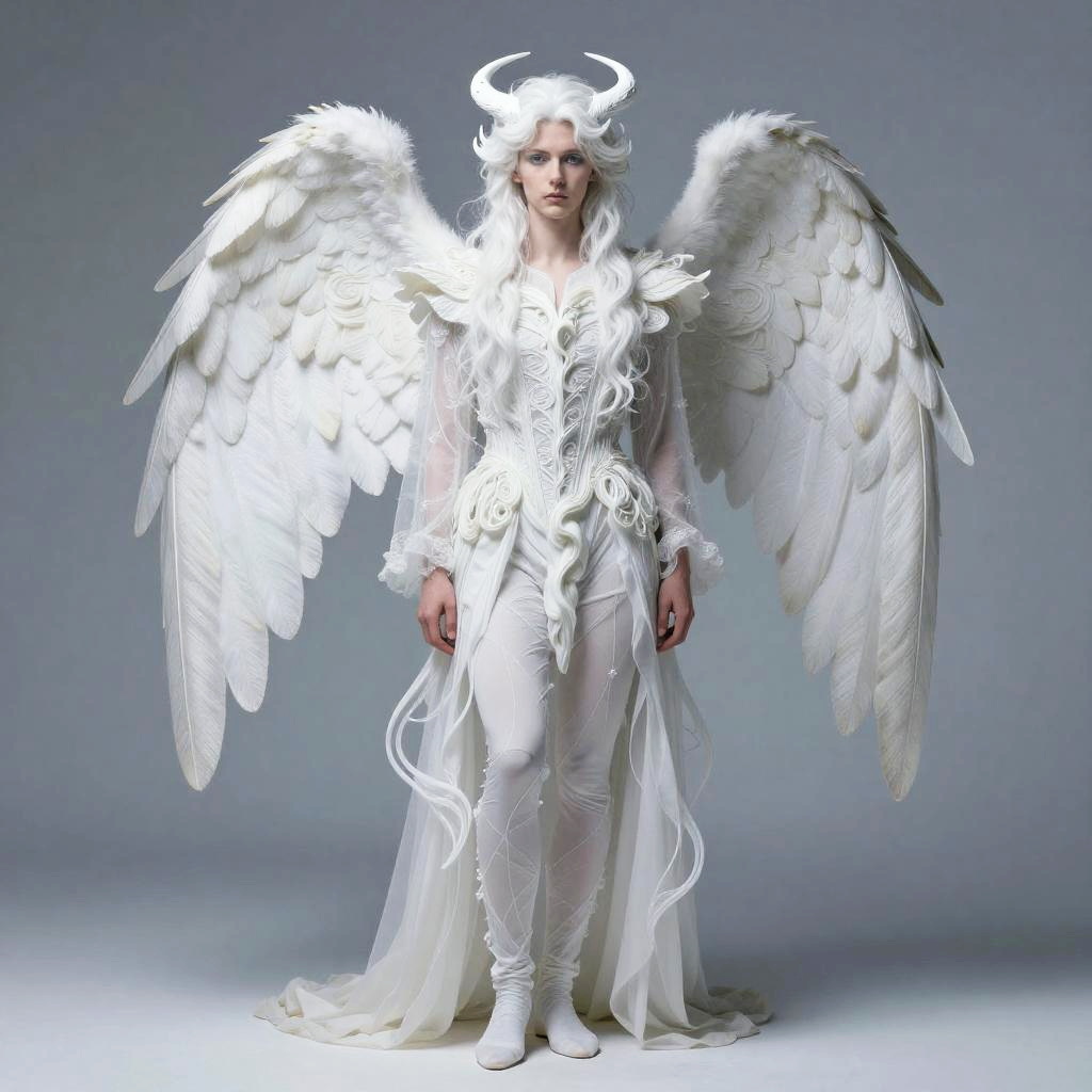 Realistic photo.Full body portrait of a handsome angelic being in fancy clothes, ghostwhite color tone, ethereal atmosphere, soft lighting, intricate details, flowing lines, art nouveau influence, by Brian Froud, Aubrey Beardsley realistic photo