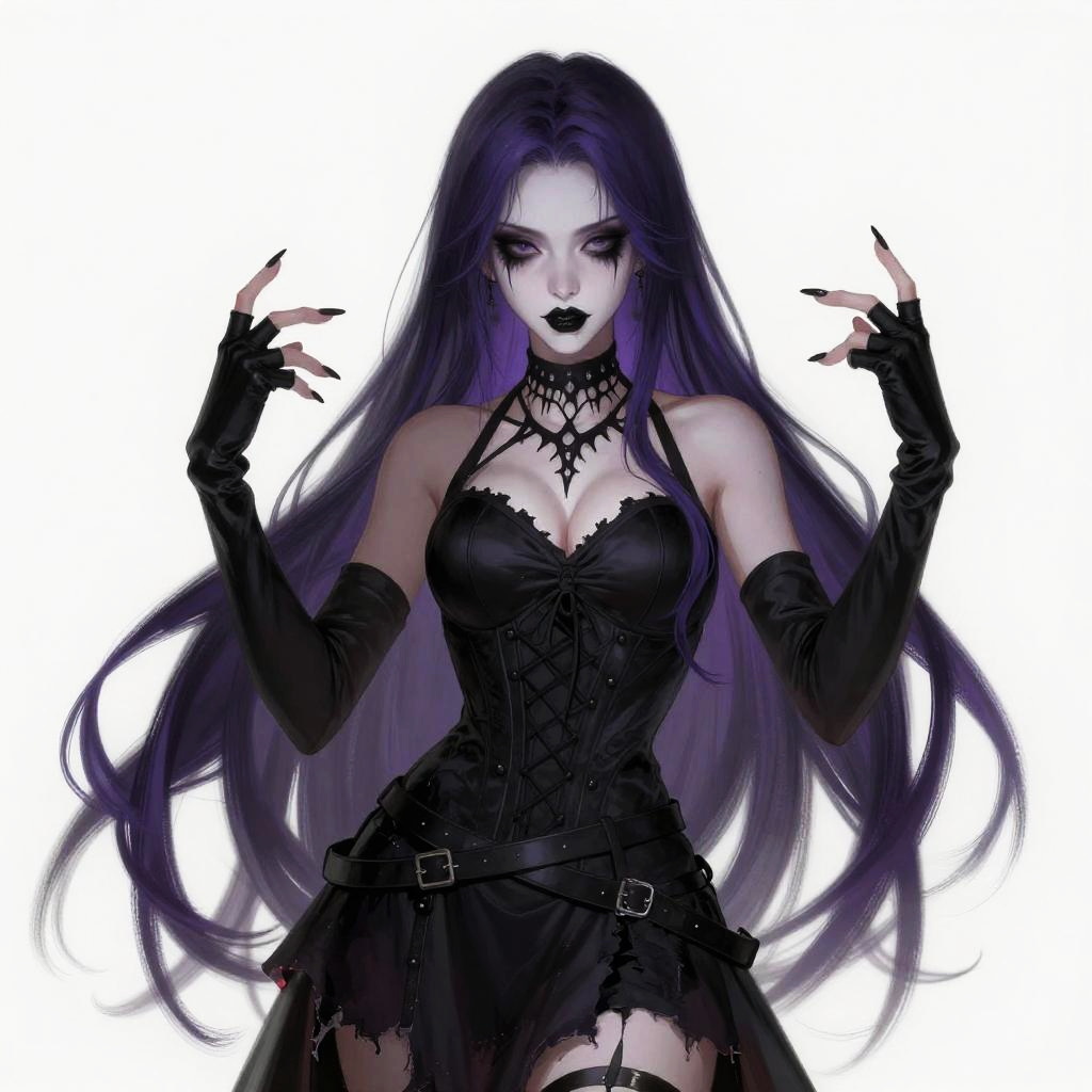 Digital illustration of a gothic-style woman with long, flowing purple hair and pale skin. She wears a black, lace-trimmed corset with a choker and matching gloves that reach her elbows. Her dark, smoky eye makeup and black lipstick add to her mysterious appearance. Her hands are raised with fingers slightly curled, showing black, manicured nails. The background is stark white, making her dark attire and hair stand out. She has a slim, toned physique and a confident, slightly enigmatic expression. The artwork features a high-contrast, dramatic style with smooth, detailed textures.