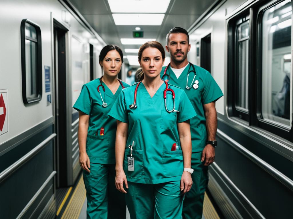Paramedic Costume Adults face swap, woman in scrubs standing in a hallway next to a train