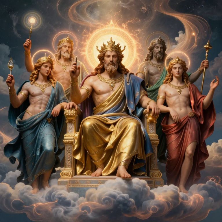 Mitologico tableau showing a pantheon of gods on a celestial throne, surrounded by swirling clouds and glowing auras, intricate robes and symbols, majestic and powerful expressions, rich textures and vivid color palette.