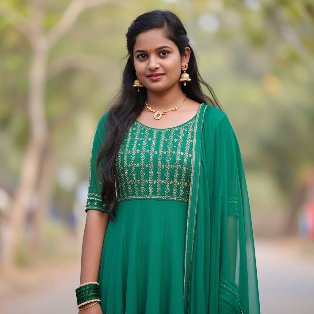 Dress wear indian engagement, 1girl, solo, jewelry, long hair, earrings, dress, necklace, bracelet, black hair, green dress, looking at viewer