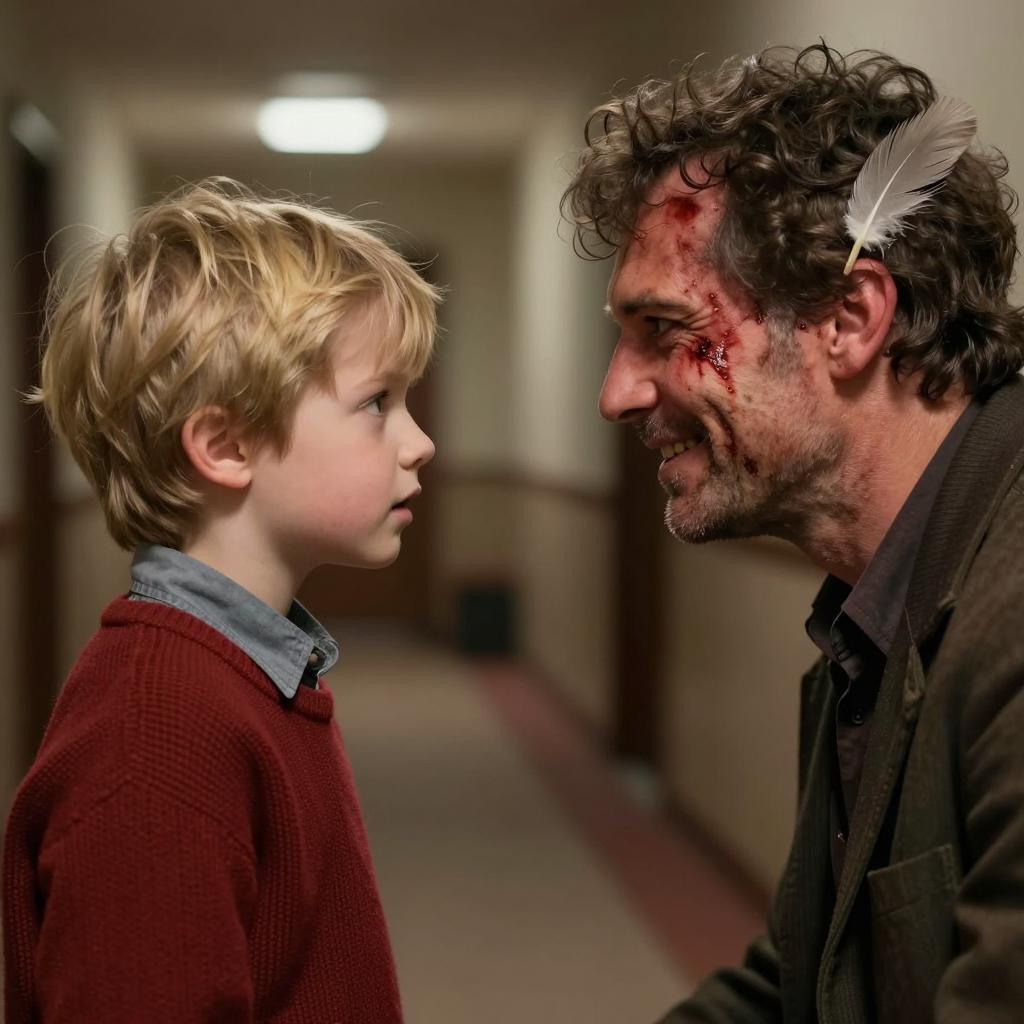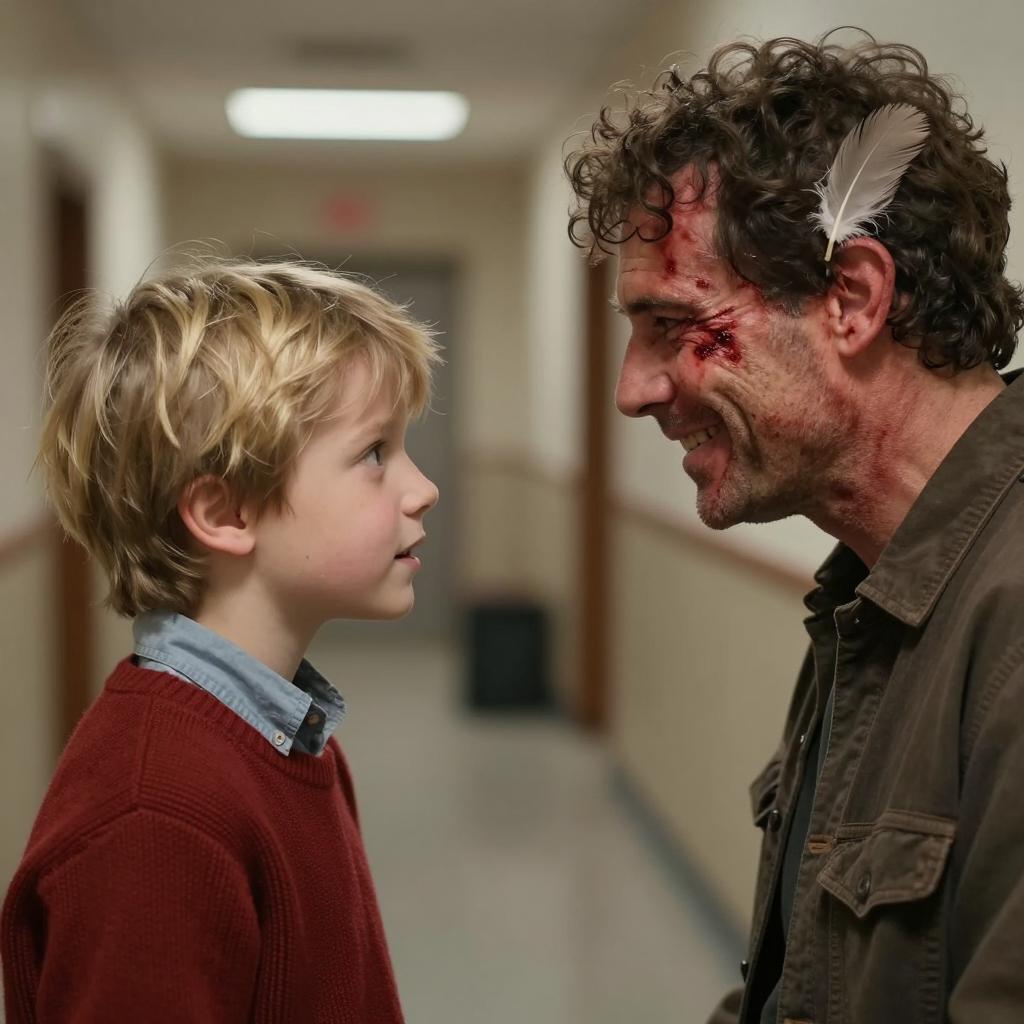 A boy and a man in a rural, wooded area. The boy, with brown hair, wears a blue shirt and gray pants, aims a rifle at the man. The man, with blood on his face and hands, wears a dark shirt and green pants, stands in front of him. The man's rifle is firing, with smoke visible. The background includes a wooden cabin, rocks, and green foliage. The boy's expression is focused, and the man's face is obscured by blood. The boy is on the left, and the man is on the right.