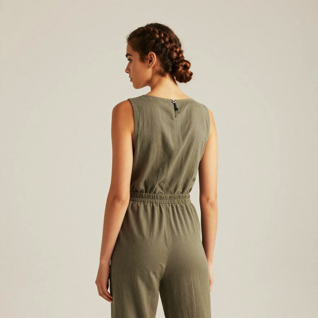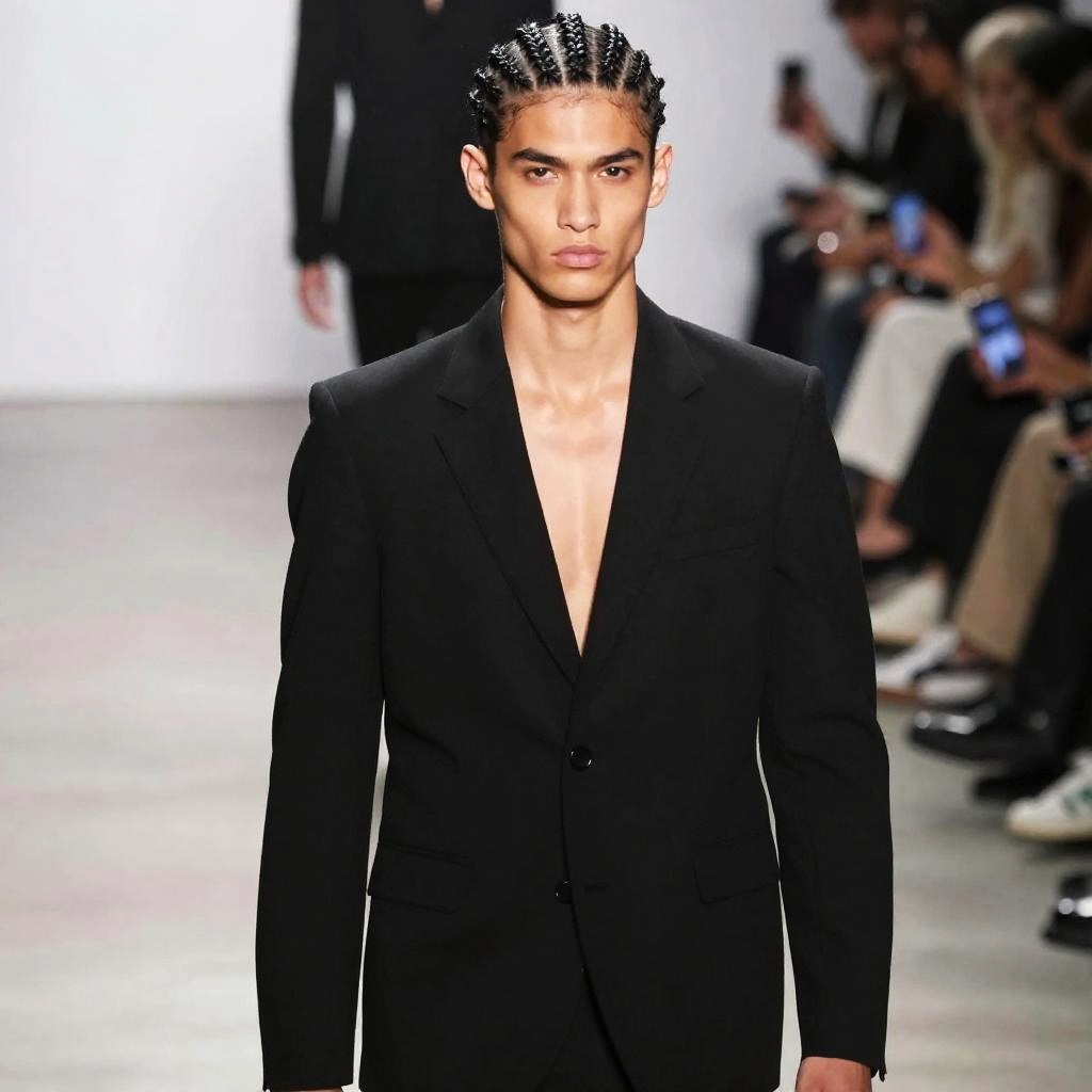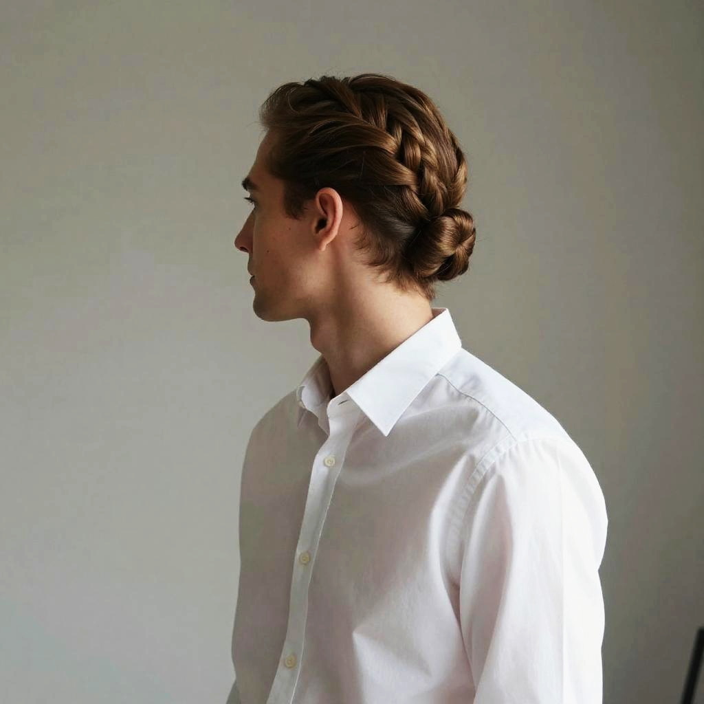 Braided Bun hairstyle on female model, wearing casual jumpsuit, in studio, captured in fashion editorial style with natural light.
