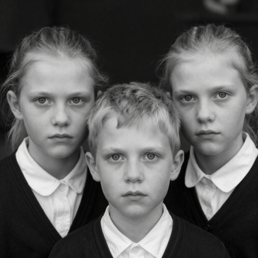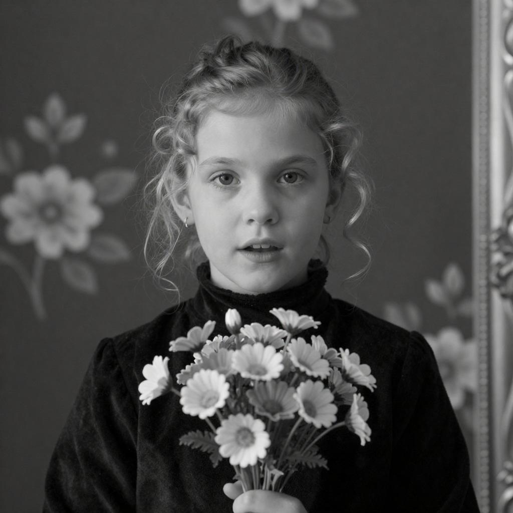 Black-and-white close-up portrait of a young girl with light curly hair, wearing a dark high-collared dress. She holds a bouquet of small daisies in front of her chest. The background features a soft floral pattern and part of an ornate frame is visible on the right side.