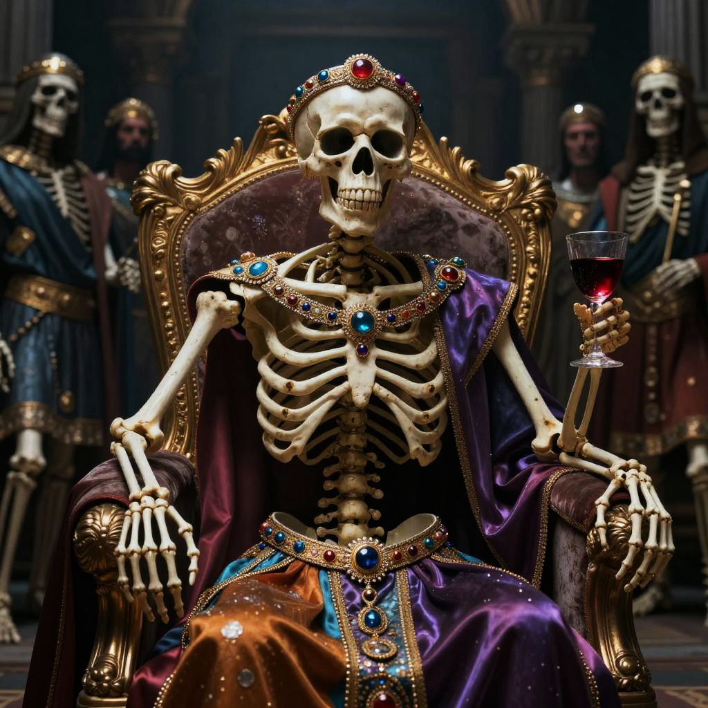 (((absurdres, highly detailed:1.2, best quality, masterpiece))), front view, medium shot, captivating lighting, 8k, (elaborate costume details:1.3), vibrant colors, ethereal glow:1.1, fantasy art, mystical atmosphere, realistic, jeweled skeleton monarch in silk robes, in aurora-lit ice cathedral built into a glacial shipwreck (shimmering ribs of hull, frosted mast-columns, stained-glass portholes casting spectral light), cradling a lantern of captured aurora swirling with motes, a gilded hunting lance tipped with a mechanical moth, and a heavy furred royal cloak pinned with a frost-encrusted brooch leaking pale light, luxurious upholstered throne, opulent jewelry, atmospheric, cinematic, dim light, dark theme, rim lighting, low key, reflections, glare, chromatic aberration:1.1, sparks:0.6, light rays, glow particles, photorealistic, hyperreal, film photography, 35mm anamorphic, dynamic composition, golden ratio, deep bokeh, lens flare:0.4, HDR10, film grain, sharpen, night mood