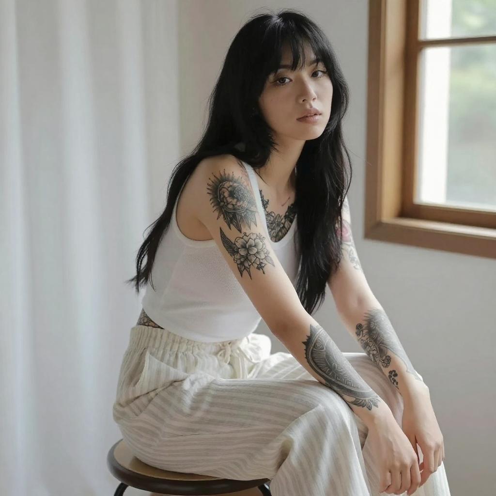 Photograph of an Asian woman with long black hair, sitting on a tiled floor against a white wall. She wears a tight, beige, strapless dress, revealing extensive colorful tattoos on her arms, chest, and neck. She sits with legs extended, hands resting between them, and feet bare. Her expression is neutral, and the background is minimalistic.