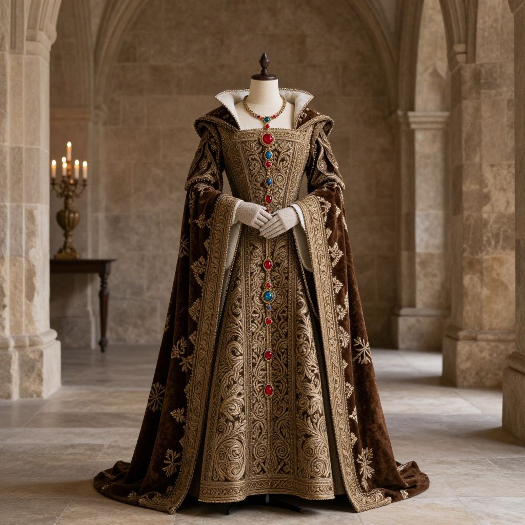 Medieval clothing for the rich, elegant nobles in richly decorated gowns and tunics, complex embroidery with gold threads, ruby and sapphire accessories, candlelit stone hall