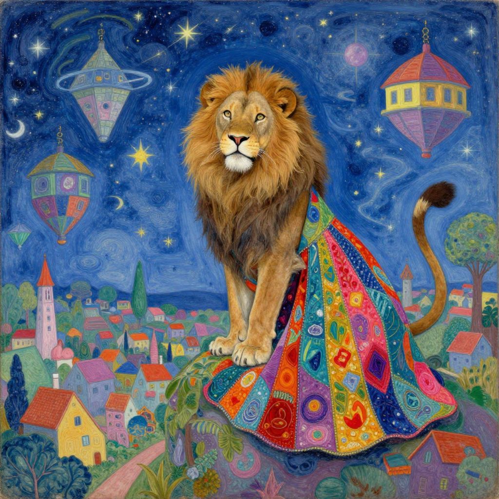 A vibrant, whimsical digital painting features a majestic lion with a golden mane, standing on a colorful, patterned skirt. The lion gazes forward with a regal expression. The background is a dreamy, starry night sky with floating, glowing houses and balloons. Below, a quaint village with red-roofed houses and a tall church tower is nestled among green trees. The lion's skirt is adorned with intricate, multicolored patterns, blending red, blue, yellow, and green. The overall style is fantastical and surreal, with rich, vivid colors and a playful, imaginative atmosphere.