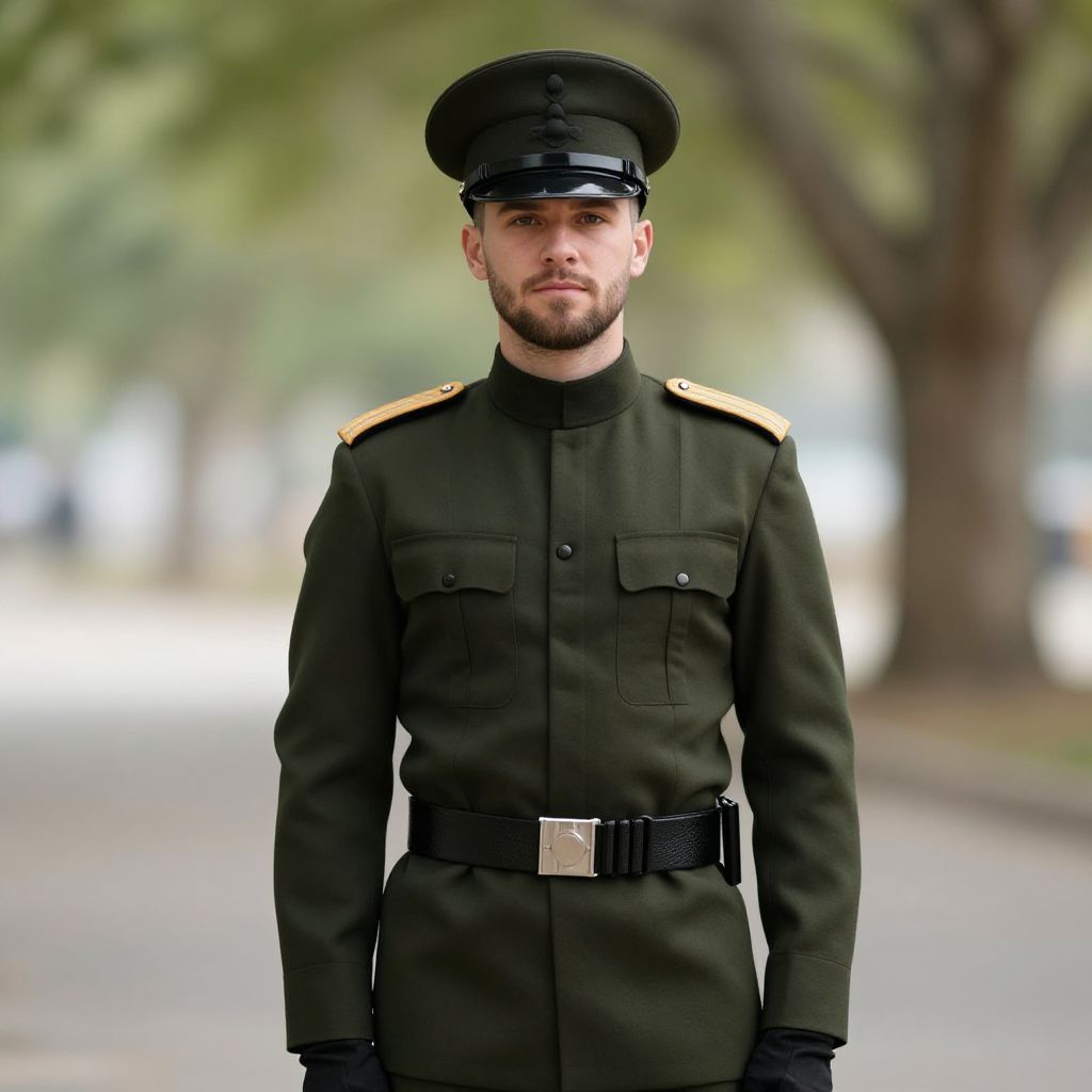 Photograph of a young, bearded Caucasian man with a serious expression, standing in a blurred outdoor setting. He wears a black military uniform with gold epaulets, black gloves, and a matching black peaked cap. The uniform is buttoned up, with two chest pockets and a black belt with a silver buckle. The background features green trees and a paved pathway, slightly out of focus, suggesting a park or garden. The man's dark hair is neatly trimmed, and his eyes are slightly squinted, conveying a focused demeanor. The overall image has a realistic, slightly soft focus effect.