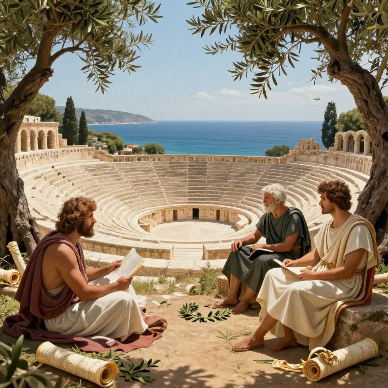 Homer's ancient Greek setting with a grand, sunlit amphitheater overlooking the Mediterranean Sea, olive trees surrounding the scene, scrolls and laurel wreaths scattered around, evoking the epic tales of the Iliad and Odyssey, in a classical painterly style.