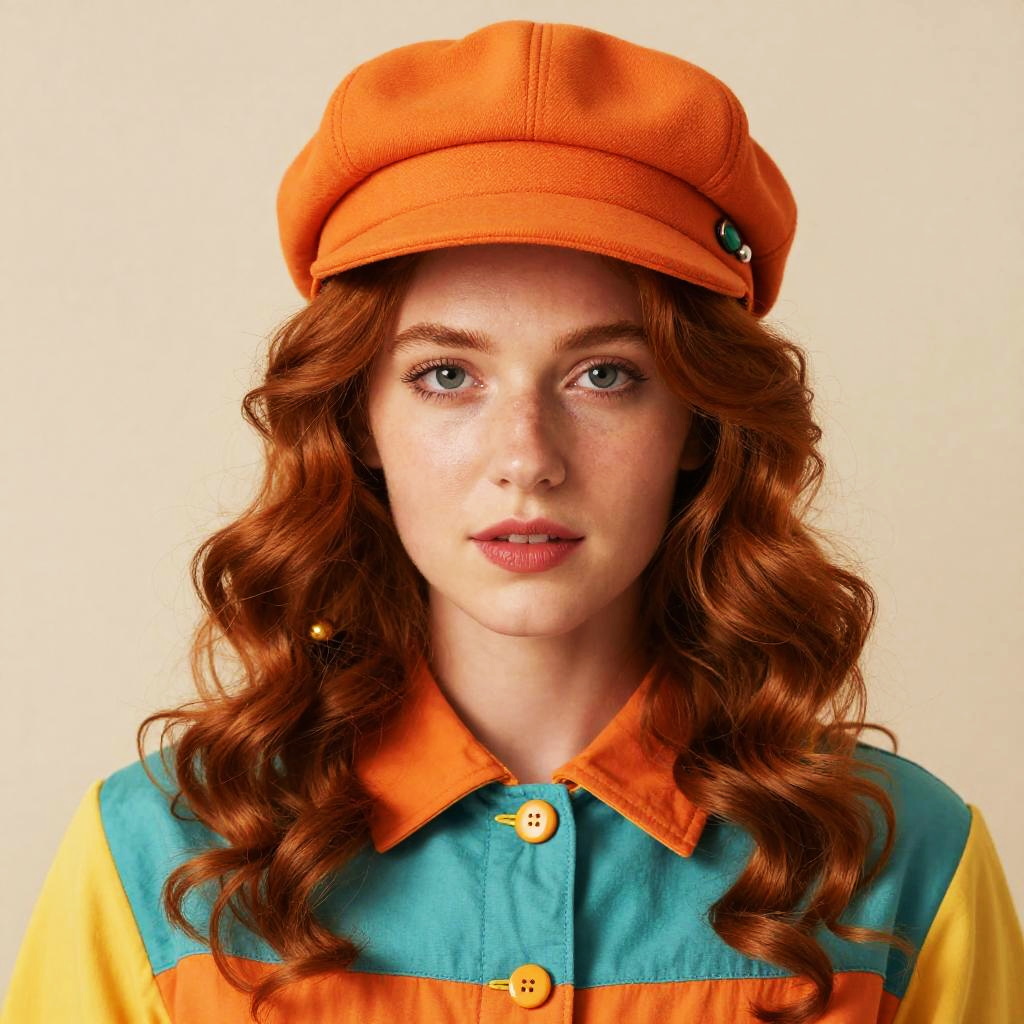 A close-up portrait of a woman with vibrant red curly hair wearing a vintage-style orange cap and colorful attire featuring teal, orange, and yellow tones with decorative buttons. The image captures a retro aesthetic with modern, crisp photography, focusing on the subject's natural beauty and detailed costume.