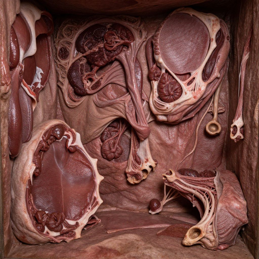 Photograph of detailed, close-up cross-section of raw, marbled meat showing intricate textures, veins, and fat layers in dark red and pink hues
