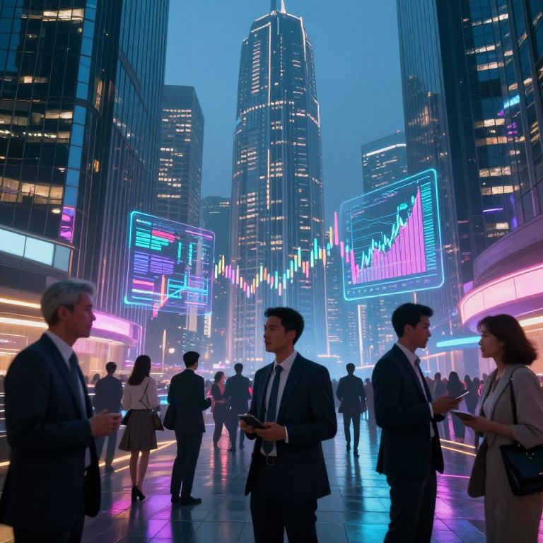 Neon-lit financial district at dusk; suited businesspeople converse in front of glowing stock market displays on towering skyscrapers.