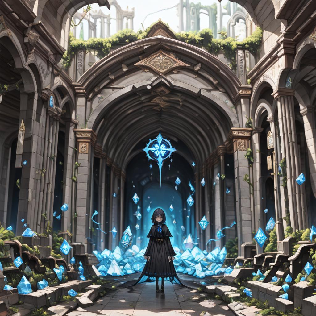 Masterpiece, (best quality:1.4), [:intricate details:0.2], 1girl, Forgotten temple ruins, overgrown vines, crumbling stone pillars, ancient runes etched into walls, glowing blue gemstones, eerie silence broken only by distant whispers, musty scent of decay, hidden chambers filled with treasure, ghostly apparitions, ominous presence lurking in the shadows, sense of foreboding
