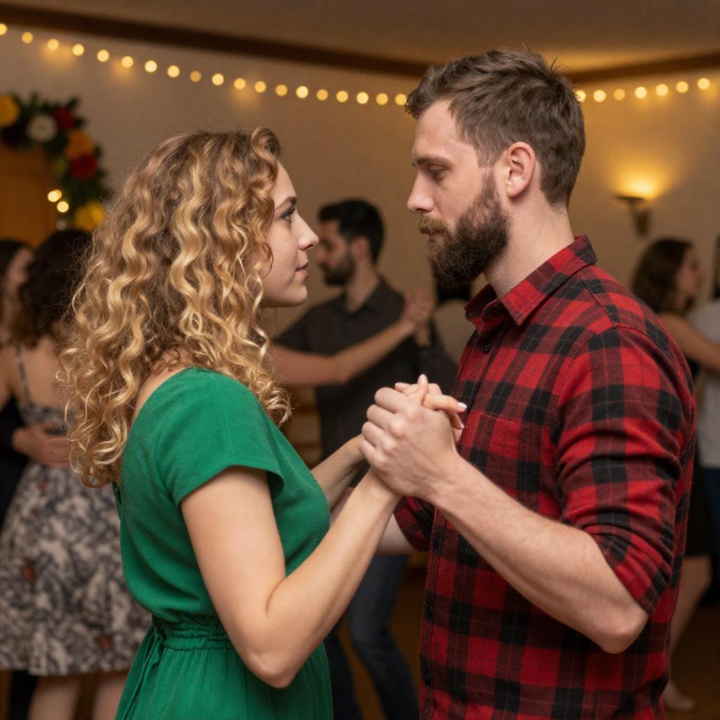 Photograph of a couple dancing closely, faces almost touching. Woman with wavy red hair, pink sleeveless top, smiling. Man with short brown hair, black shirt, smiling. Background: dimly lit, string lights, orange balloon, people in the background.