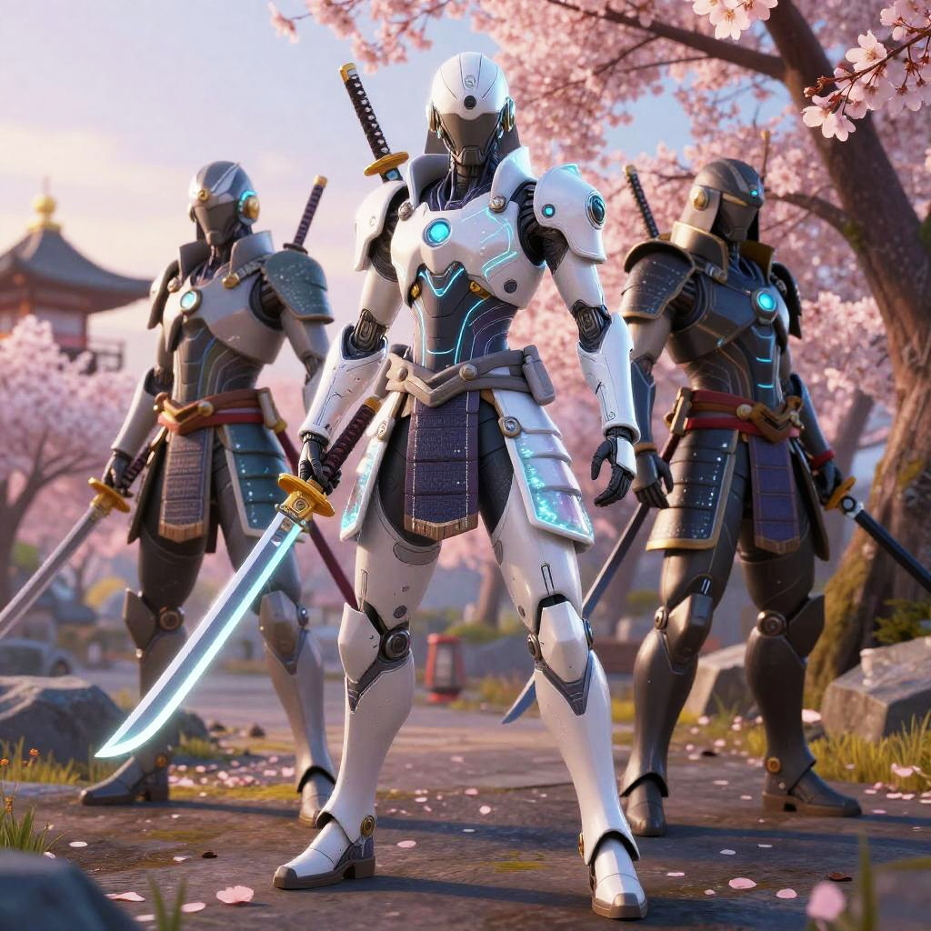Fortnite art skins of futuristic samurai warriors equipped with high-tech katanas and holographic armor plating, positioned in a serene cherry blossom garden at dusk, combining traditional Japanese aesthetics with advanced technology, soft pastel skies contrasting with glowing armor.