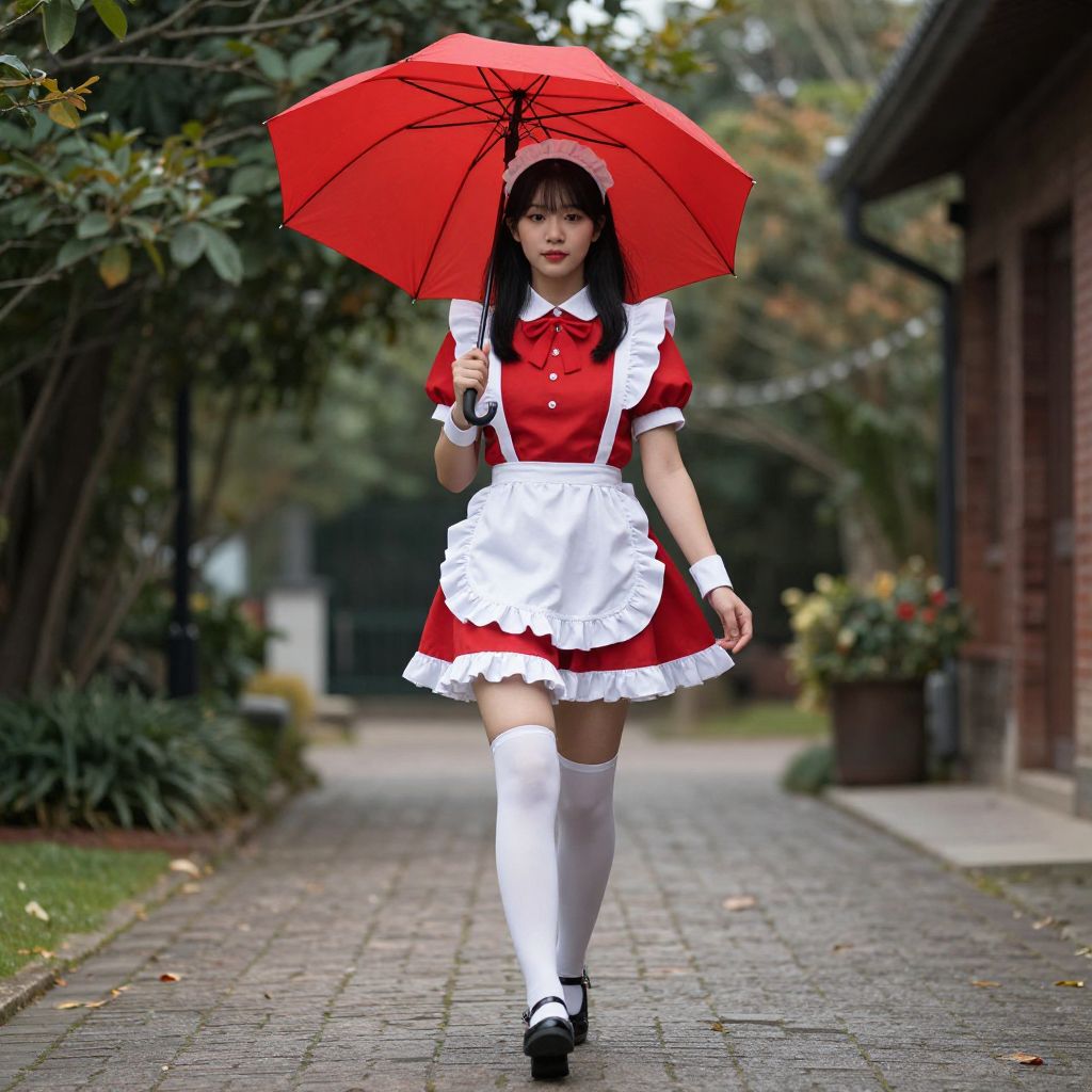 Maid Dance Costume, woman in a maid costume walking down a walkway with a red umbrella