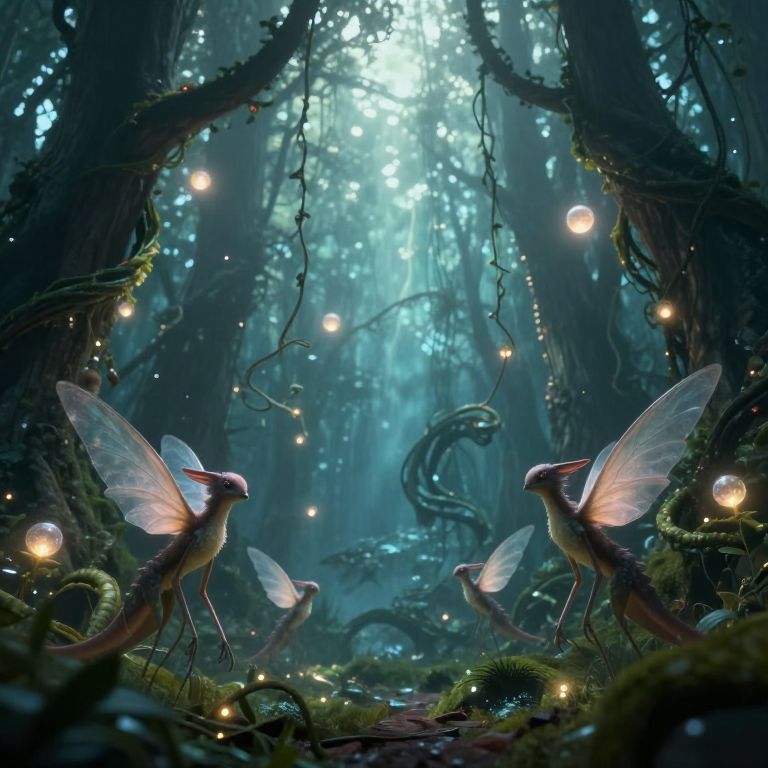 Acturian forest scene illuminated by floating orbs and twisting vines emitting soft light, inhabited by fragile winged Acturian creatures with elongated limbs and ethereal features, blending fantasy and sci-fi elements in a surreal, dreamlike environment.