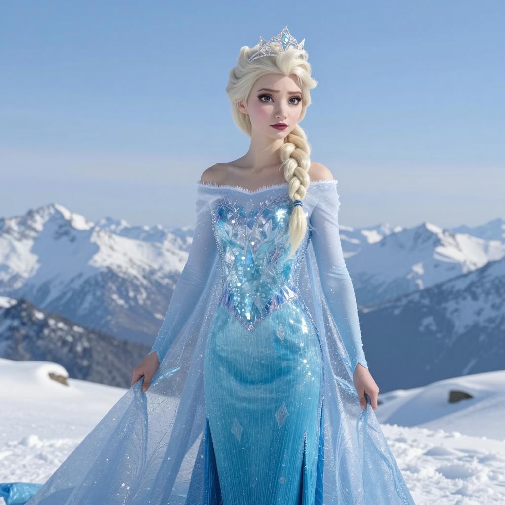Photorealistic portrait of a fair-skinned woman dressed as an ice queen standing in a snowy mountain landscape. She wears an ice blue, off-shoulder gown with intricate ice-like patterns and shimmering details. Her long blonde hair is styled in a braid, and she has a silver tiara. The scene features a clear blue sky and snow-covered mountain peaks in the background, with soft natural lighting enhancing the elegant and ethereal atmosphere.