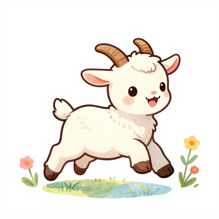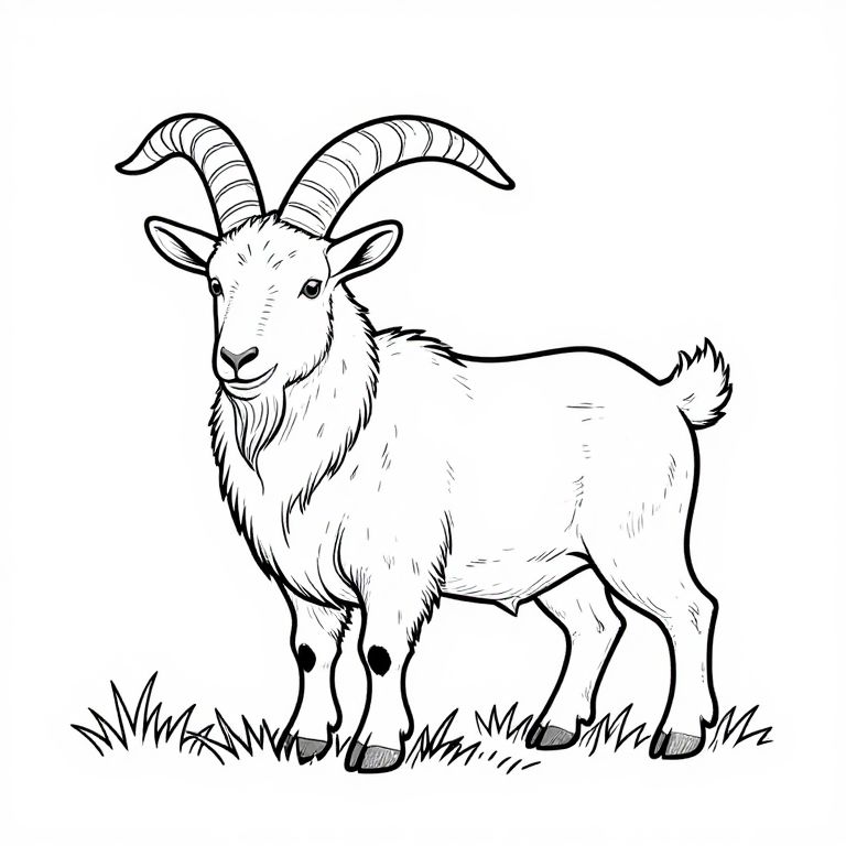 Colorful digital drawing of a stylized goat with curved black horns, bright orange eyes, white and gray fur, red highlights, and green tail tu