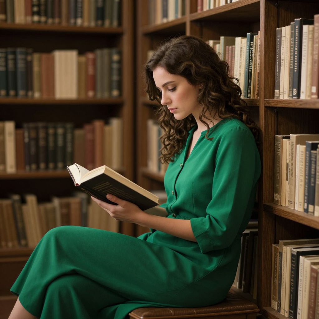 In a quiet sanctuary of knowledge, a woman in emerald green sits immersed in the timeless embrace of literature, her presence a testament to the enduring power of introspection and the solace found in the stillness of a soul seeking understanding.