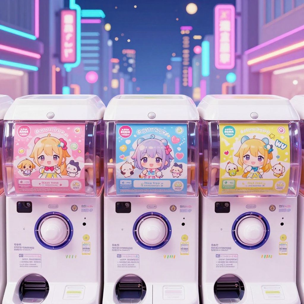 Cute anime characters collecting online gachapon capsules, virtual prize showcase, neon-lit urban night cityscape background, vivid pastel colors, energetic and lively