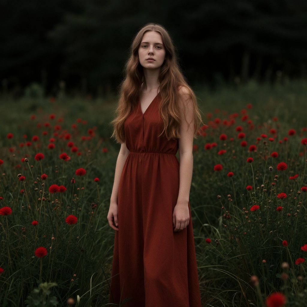 A young woman stands in a field of vibrant red flowers, wearing a matching long brownish-red dress that complements the natural setting. Her long hair flows freely, and the composition highlights a serene yet dramatic atmosphere with deep greens and striking reds.