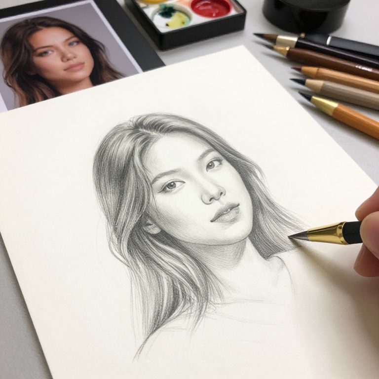 How to turn photo into drawing: an artistic depiction of a vibrant photo slowly morphing into a beautiful hand-drawn sketch on textured paper, with soft shading and fine pencil strokes visible, set against a creative studio background filled with art tools.
