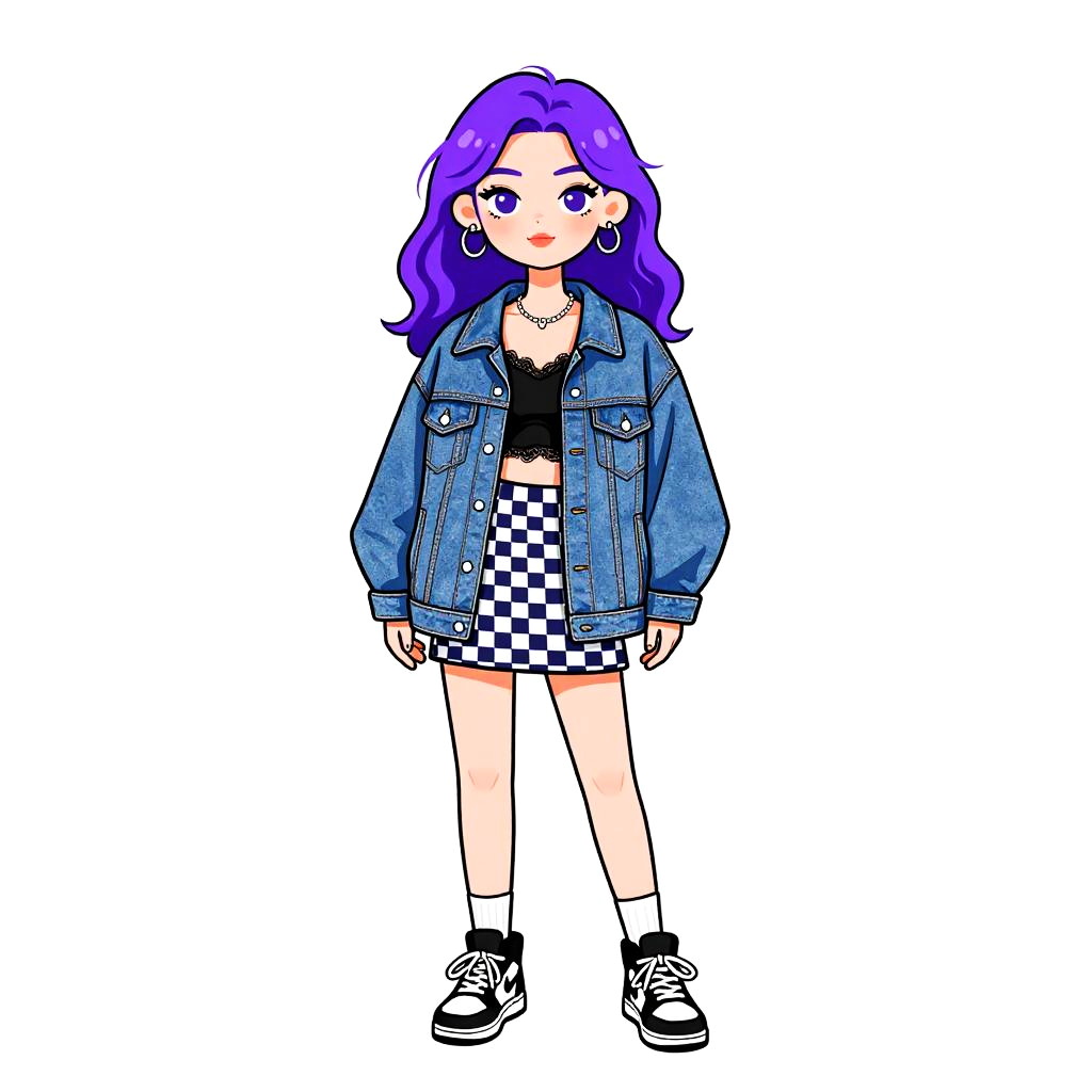 Woman with pretty face and pretty hair. Woman, casual streetwear, oversized light-wash denim jacket, black lace-trimmed crop top, high-waisted checkered mini skirt in dark blue and white, black and white high-top sneakers, white crew socks, white backdrop --sref 1461