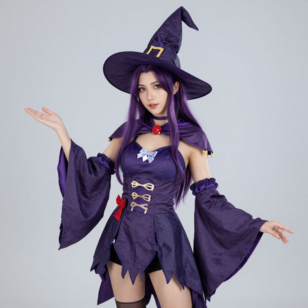 Photograph of a woman cosplaying as a witch against a plain white background. She has long, straight purple hair and wears a large, black, pointed witch hat with a yellow buckle. Her outfit includes a black, off-the-shoulder dress with wide sleeves, lace-up details on the front, and a white bow on the chest. She also has a black cape with a red brooch and black thigh-high stockings. Her right hand is raised with an open palm, and her left hand is slightly bent. She has pale skin, red lipstick, and a confident expression. The dress has a tattered, jagged hem.