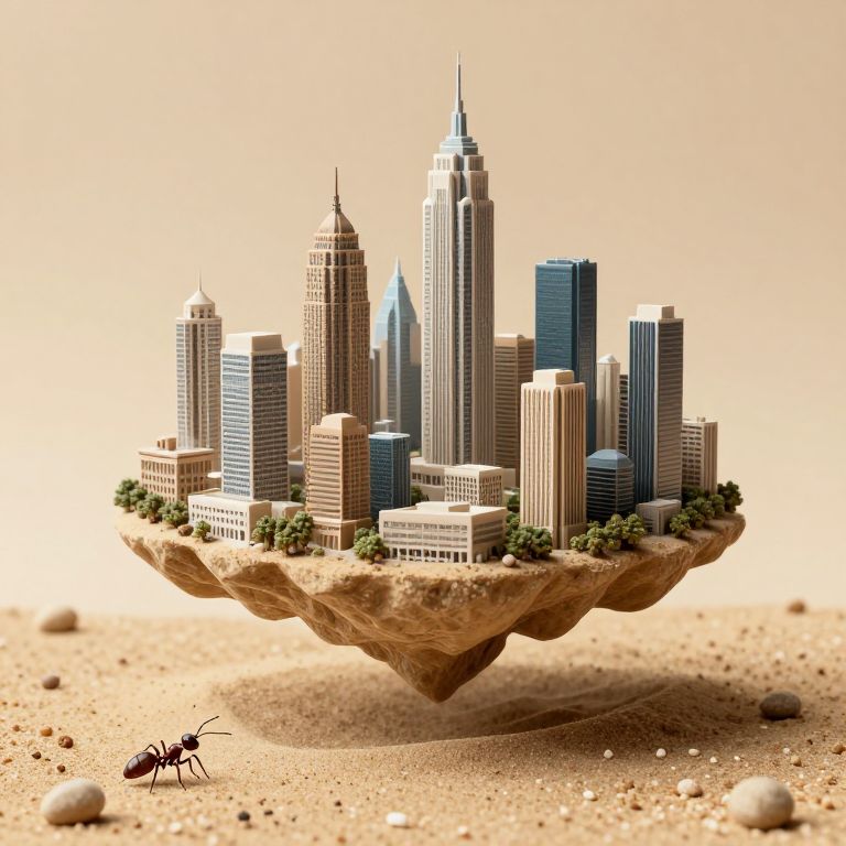 A minuscule metropolis of intricately carved skyscrapers floats serenely above a bed of scattered sand grains, defying gravity as a solitary ant scurries beneath, seemingly dwarfed by the impossible feat of architectural wonder.