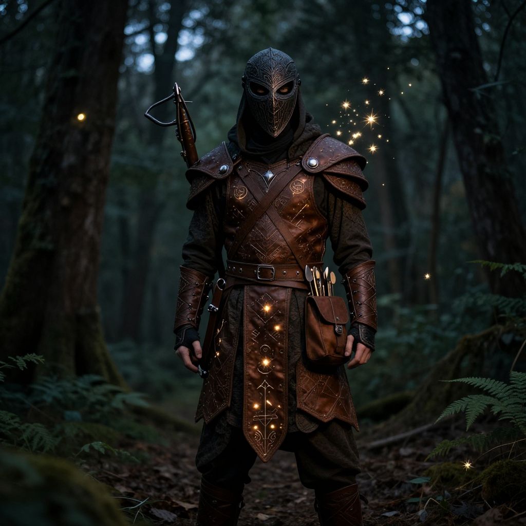 Fairy hunter costume worn by a mysterious figure in a dense enchanted forest, intricate leather armor with glowing runes, carrying a crossbow and a satchel of magical tools, twilight atmosphere with sparkling fairy lights around.