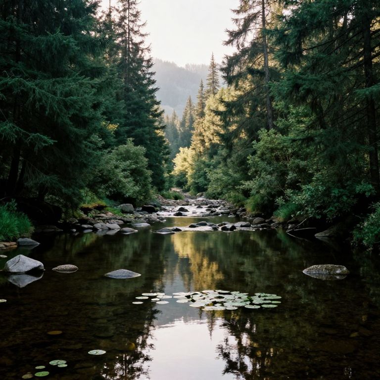 Calm waters of a serene forest stream reflect the towering evergreen trees and dappled sunlight, creating a tranquil mirror-like surface dotted with submerged stones and floating lily pads, while the misty horizon hints at distant hills and unseen paths.