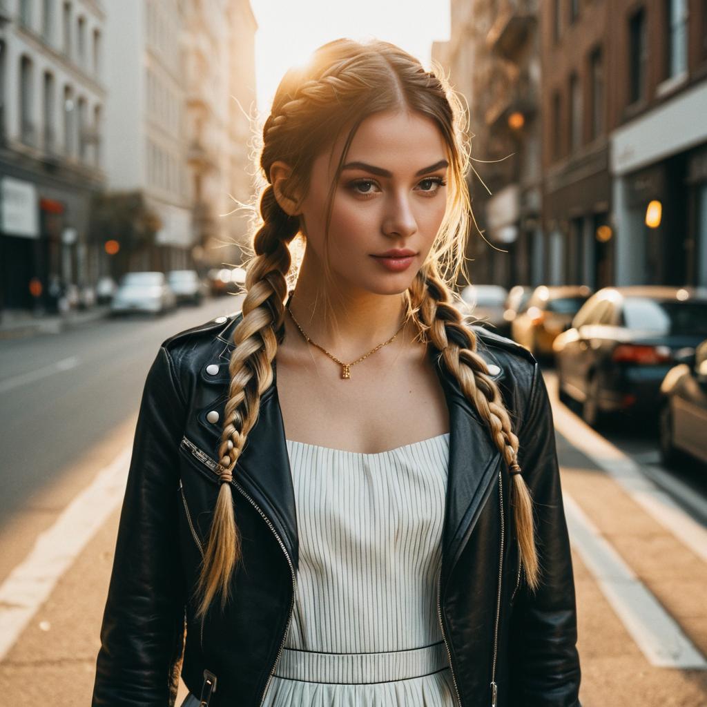 Dutch Braids hairstyle on teenage girl, wearing cotton sundress, in beach promenade, captured in fashion editorial style with dreamy tone.