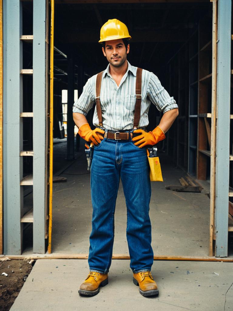 Lady construction worker, solo, gloves, 1boy, brown footwear, suspenders, boots, belt, full body, male focus, pants, yellow gloves, shirt, hat, standing, looking at viewer, white headwear, orange gloves, parody, denim, blue pants