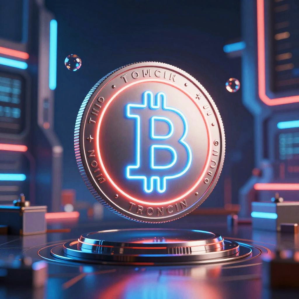 Troncoin digital currency concept, glowing neon coin floating in a futuristic cybernetic cityscape, blue and red neon lights reflecting off metallic surfaces, high-tech blockchain elements surrounding the coin, ultra-detailed, vibrant sci-fi artwork