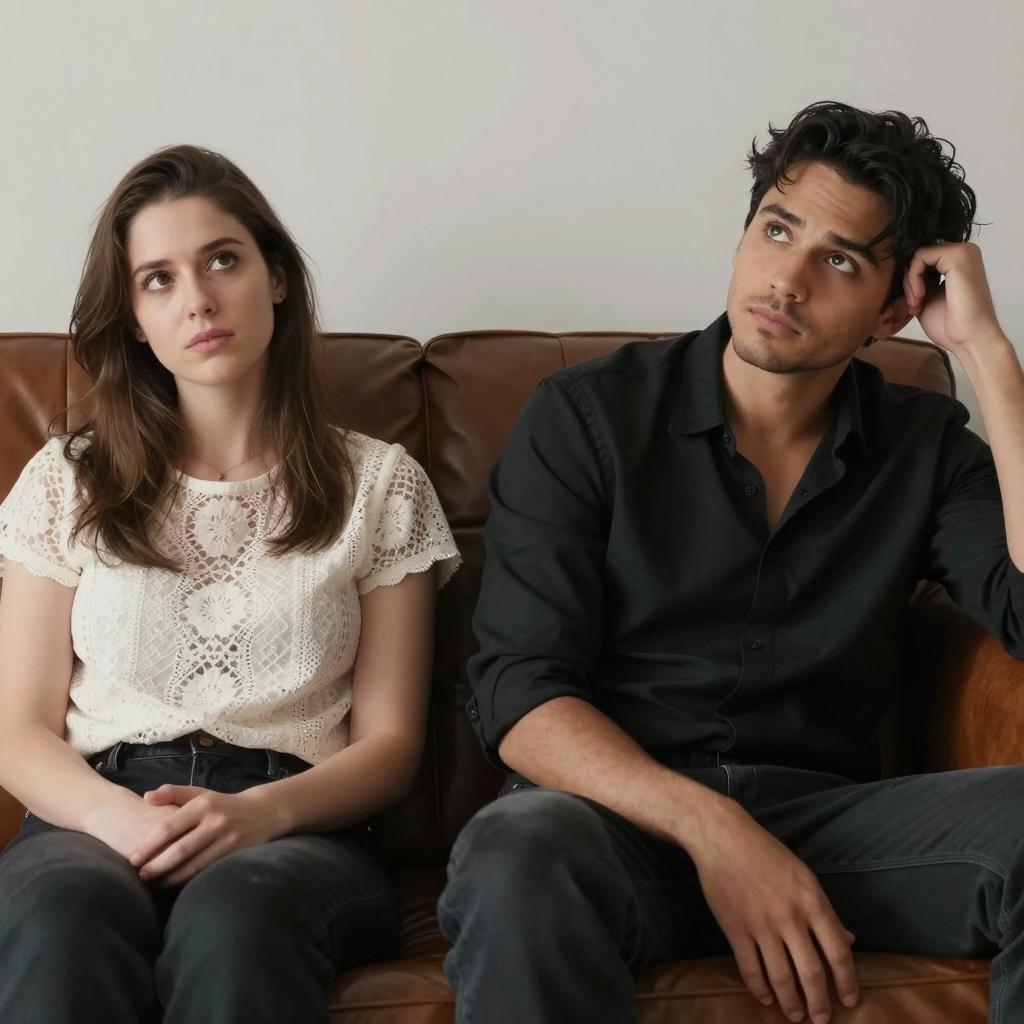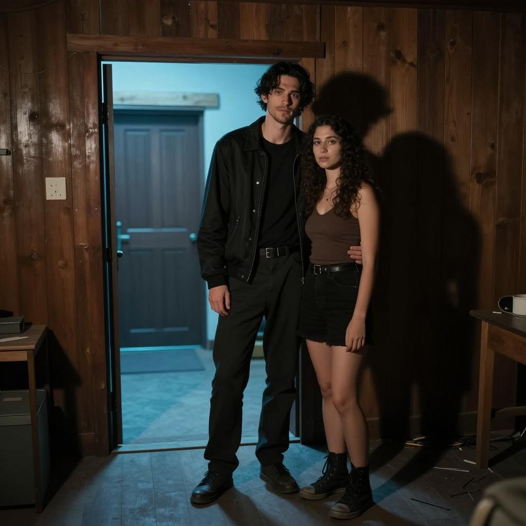 Two people stand in a dimly lit wooden room with a doorway emitting blue light. The man, tall with dark hair, wears a black jacket and pants. The woman, shorter with curly hair, wears a brown top and black shorts. They stand close together, with the man's arm around her waist. The room has dark wood ures and scattered objects. Blue light from the doorway contrasts with the dark surroundings.