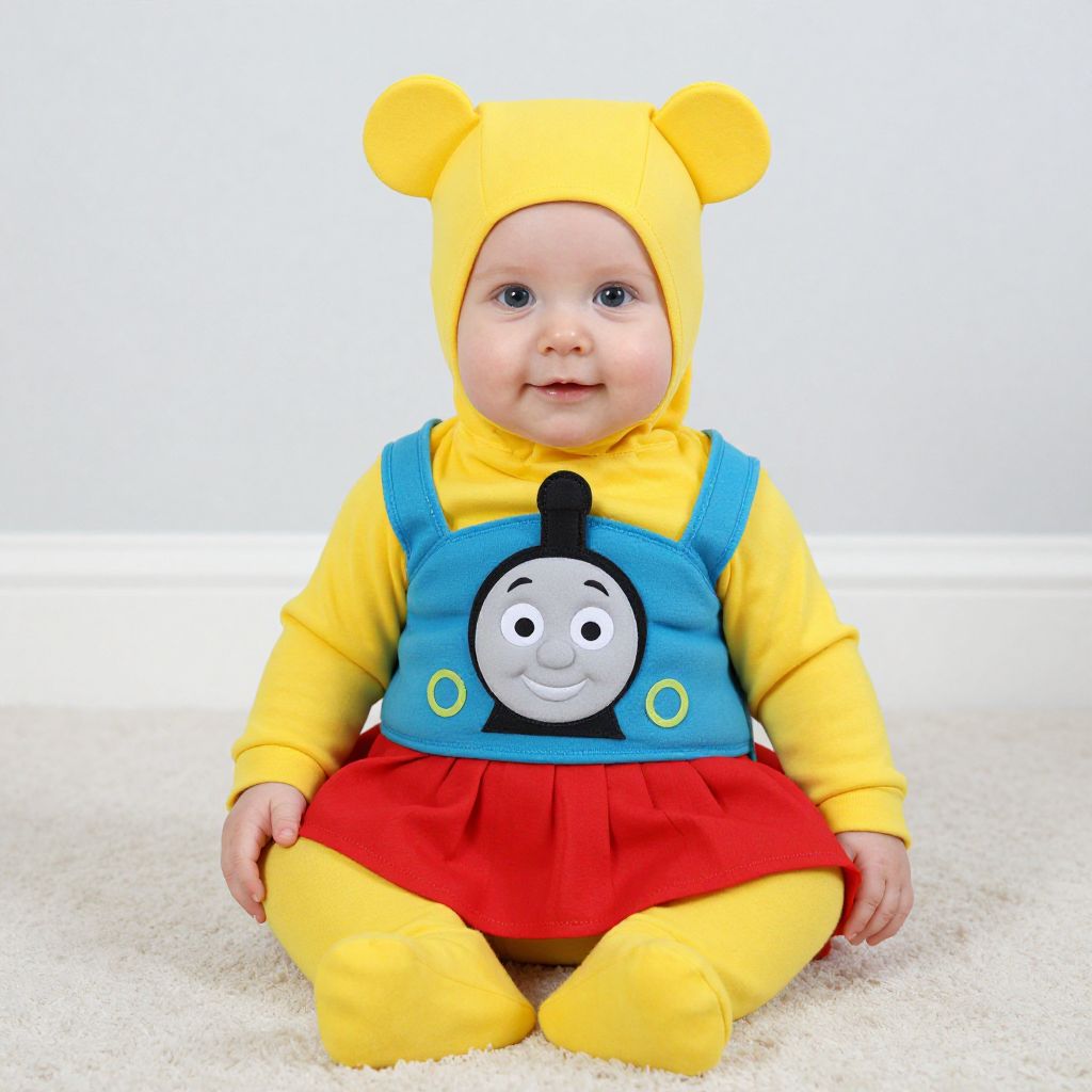 Thomas Tank Engine Infant Costume, baby wearing a yellow bear costume and a red skirt