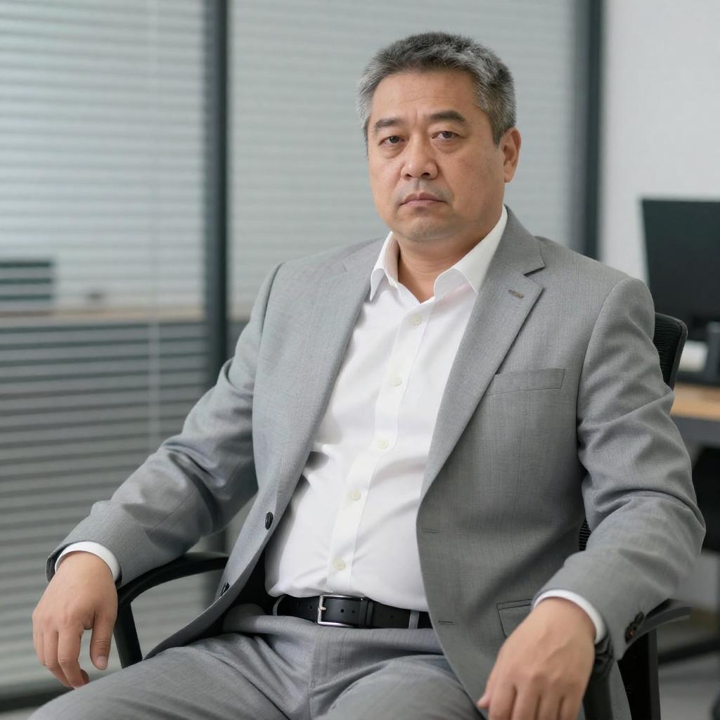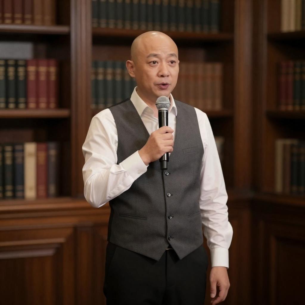 Photograph of an Asian man with short black hair, wearing a light gray suit, white shirt, and purple tie, holding a microphone and speaking. He stands in front of a purple curtain with string lights, with a floral arrangement on a table in the foreground. A blurred figure is partially visible in the right foreground.
