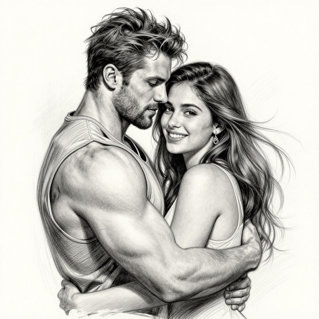 In this detailed pencil sketch, a muscular man with tousled hair and a beard is hugging a beautiful young woman with long, flowing hair. The man, dressed in a sleeveless shirt, exudes strength and confidence, his broad shoulders and defined muscles prominently displayed. The woman, adorned with a delicate earring, leans into the embrace, her face lit up with a radiant smile. The sketch captures the intimate moment with exquisite detail, from the texture of the man's beard and the woman's hair to the subtle folds in their clothing. The composition is intimate and warm, with the couple positioned closely together, creating a sense of connection and affection. The background is minimal, allowing the focus to remain on the emotional exchange between the two figures.