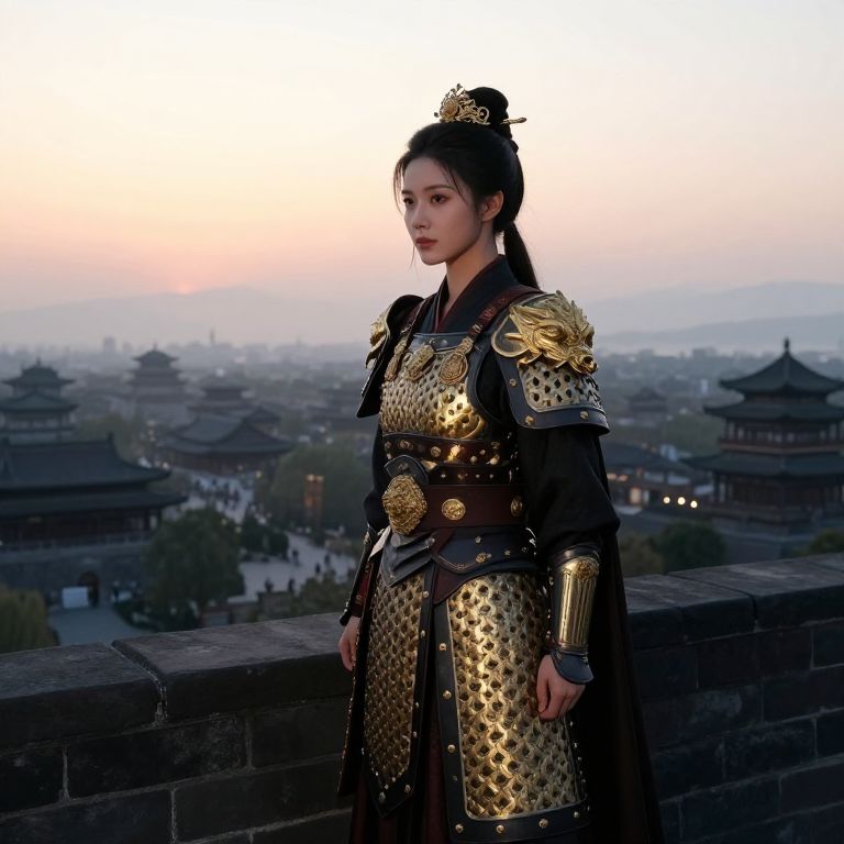 Chinese female warrior standing atop a fortress wall at dawn, ornate armor gleaming with gold accents, traditional hairstyle with hairpins, overlooking a vast ancient city, soft morning mist, inspiring and majestic scene