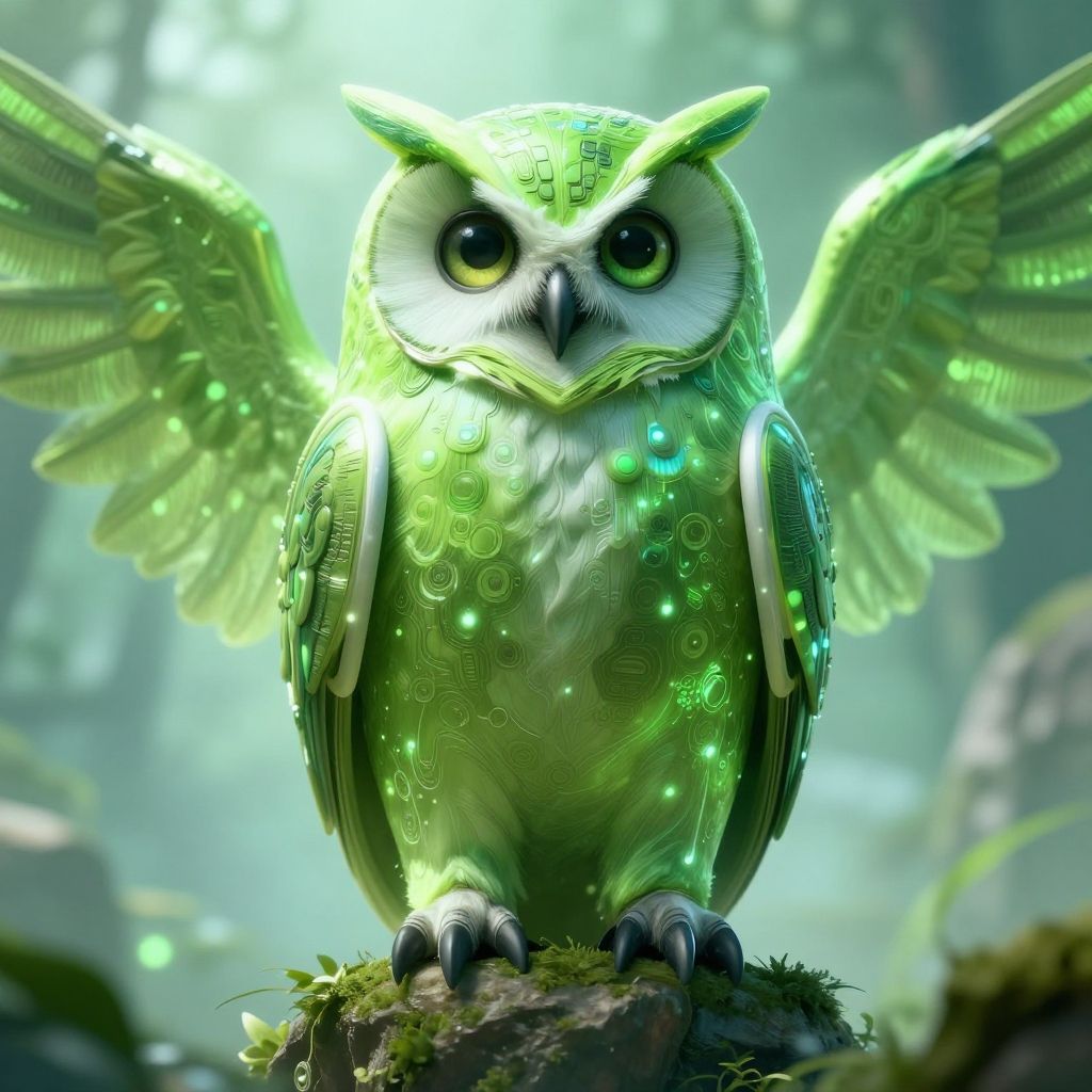 A highly detailed, digital CGI image of a glowing, green owl with large, illuminated eyes and outstretched wings. The owl's feathers are intricate, featuring circular patterns and a radiant green hue. It stands on a moss-covered rock in a misty forest, with soft, greenish light filtering through the background. The owl's wings and body exhibit a bioluminescent effect, adding a magical, ethereal quality to the scene. The image has a fantasy, whimsical style with a focus on vibrant, luminescent colors and intricate textures.