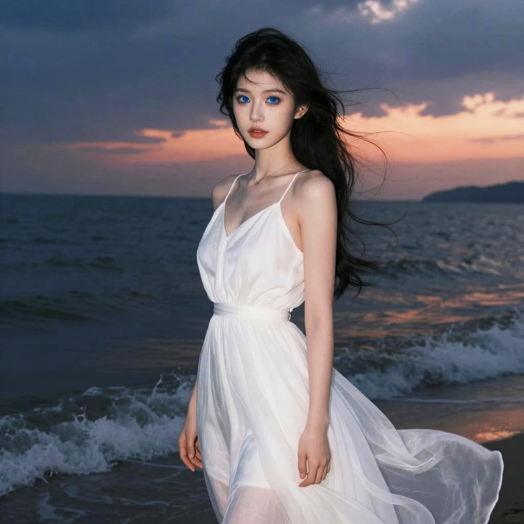 Girl with blue eyes and black hair wearing a flowing white dress by the seaside at sunset, dramatic sky, gentle waves, ethereal atmosphere, finely detailed, painterly style