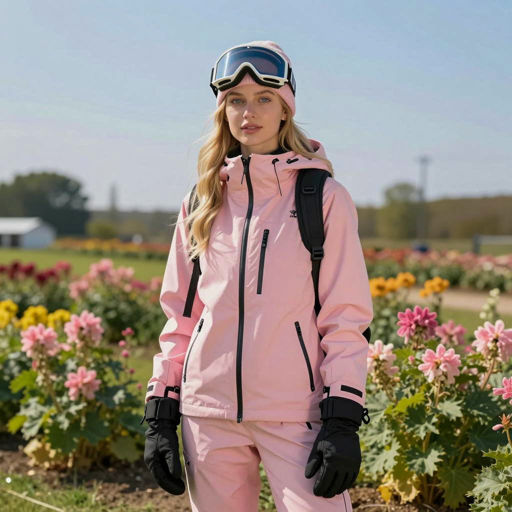 Photograph of a blonde woman standing in a snowy outdoor setting. She wears a pink pom-pom beanie, pink ski goggles, a pink and pastel diamond-patterned sweater, and a floral jacket. She has pink knee-high socks and a pink scarf. She stands in front of a metal ski rack with trees and snow-covered mountains in the background. Her arms are relaxed by her sides. She has a neutral expression. The image has a bright, natural light.