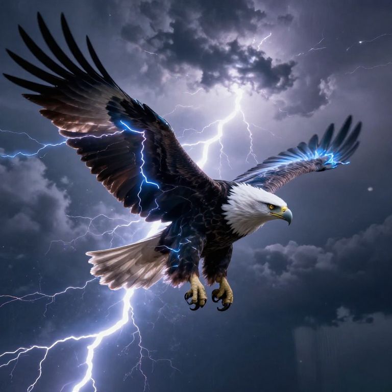 A vivid digital artwork depicts a majestic bald eagle with dark brown feathers and a white head, flying against a dramatic stormy sky. The eagle's wings are outstretched, showcasing blue electric sparks along the edges. Bright white lightning bolts illuminate the dark, cloud-filled background, enhancing the intensity of the scene. The eagle's sharp yellow beak and intense gaze add to its powerful presence. The overall color palette includes dark blues and grays, contrasting with the bright white and blue lightning. The image is highly detailed and dynamic, capturing a sense of movement and energy.