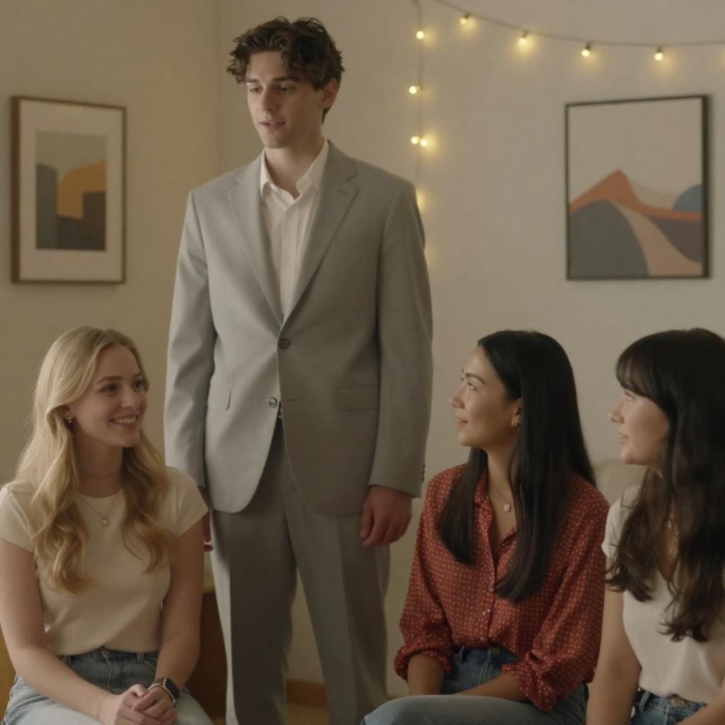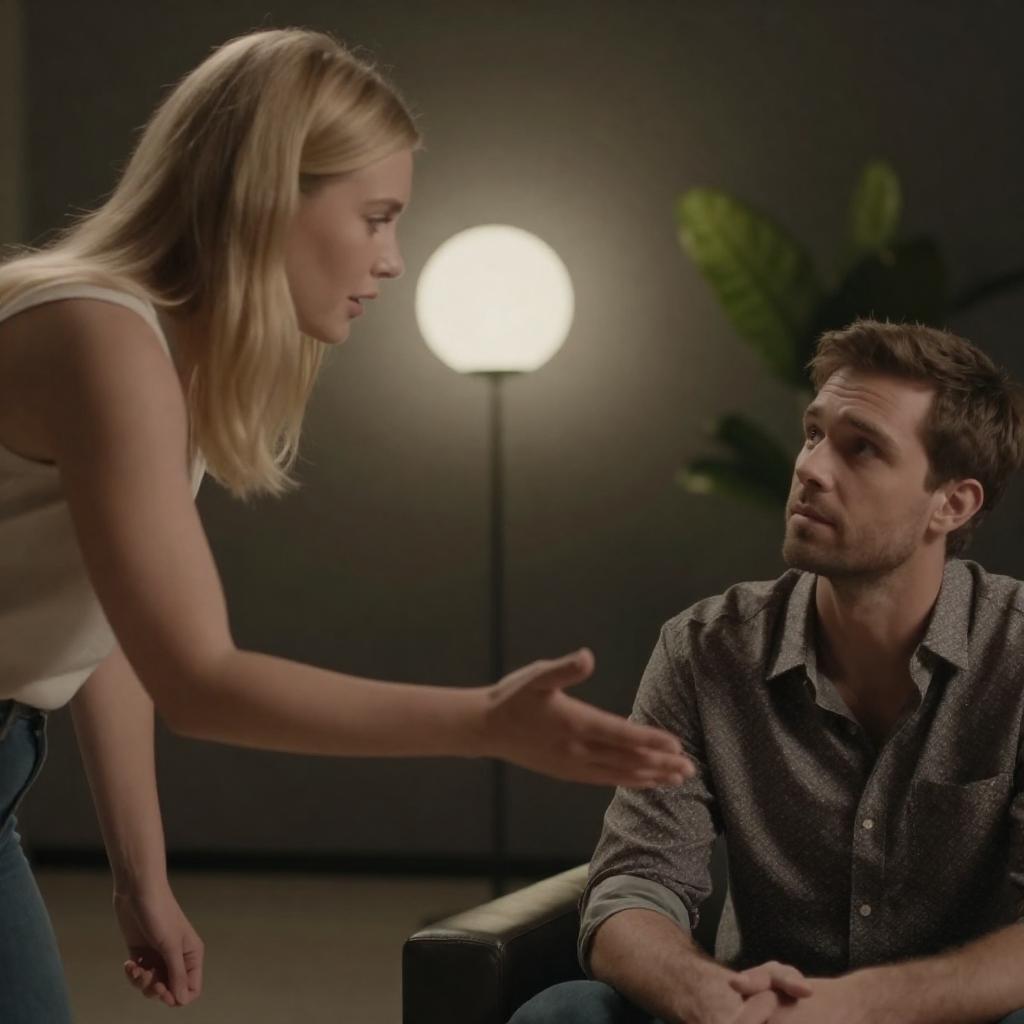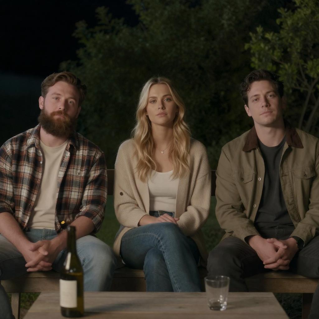Three people sitting on a patio at night. A bearded man in a plaid shirt, a blonde woman in a cardigan, and a dark-haired man in a jacket. Dark green foliage in the background. Table with a bottle and glass. All people have relaxed postures and neutral expressions.